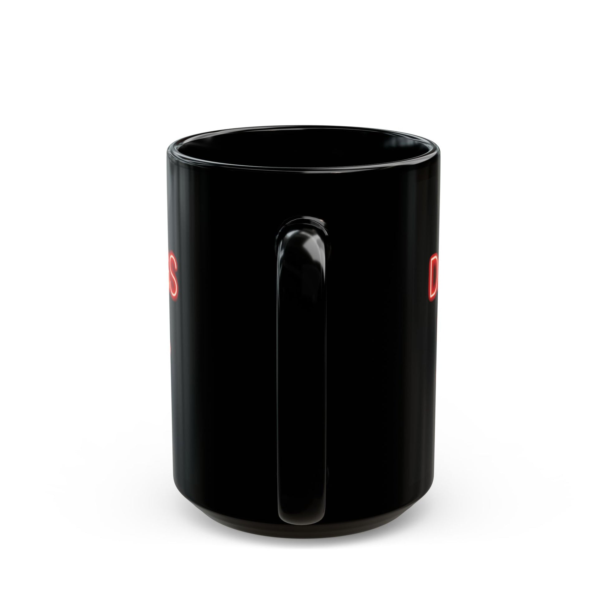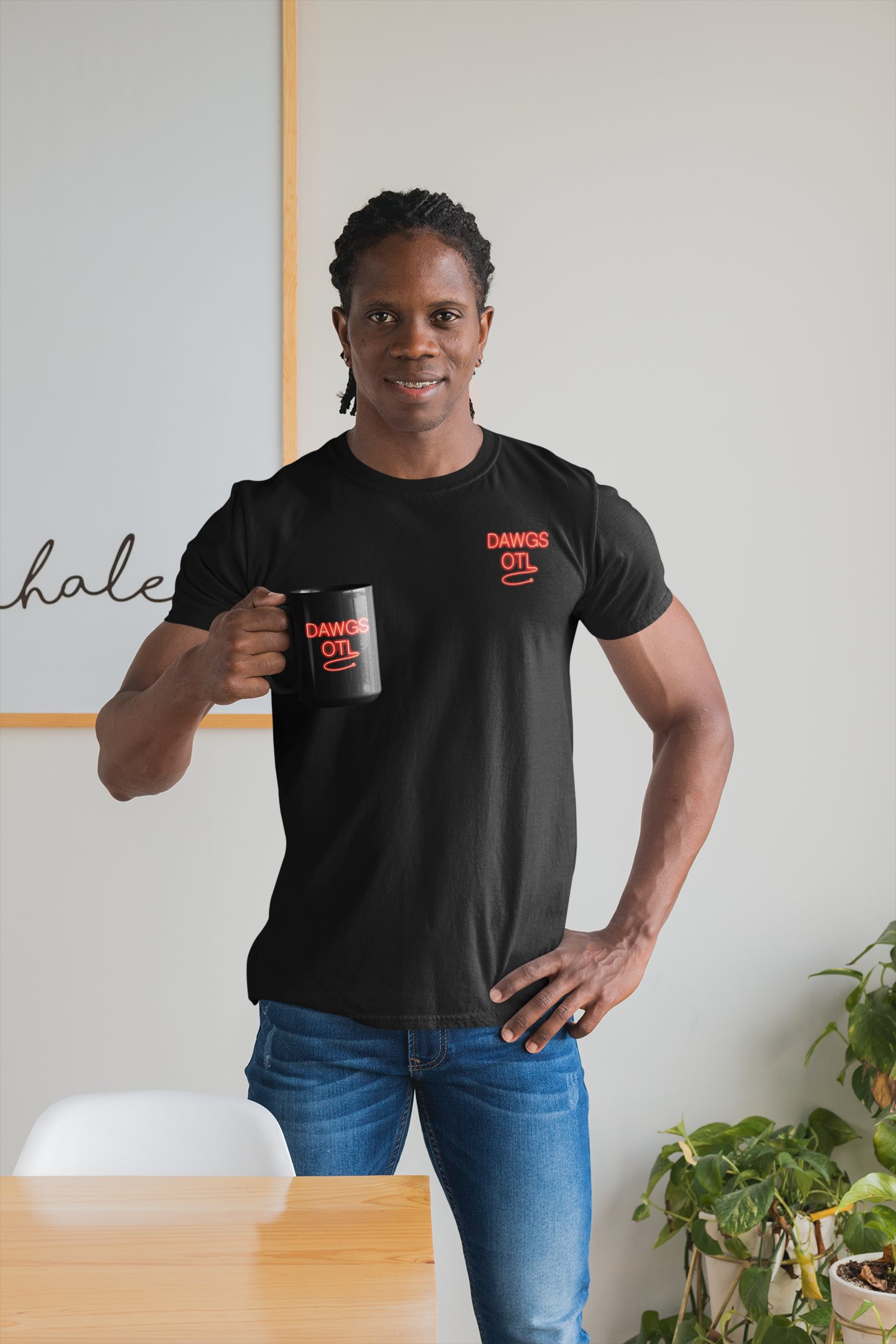 DAWGS OTL Neon-Style Black Coffee Mug — 11oz & 15oz, perfect for DAWG FANs and GEORGIA BULLDOGS supporters. This glossy ceramic mug with vibrant colors is ideal for adults and can be used in the microwave and dishwasher. It meets lead and cadmium level requirements.