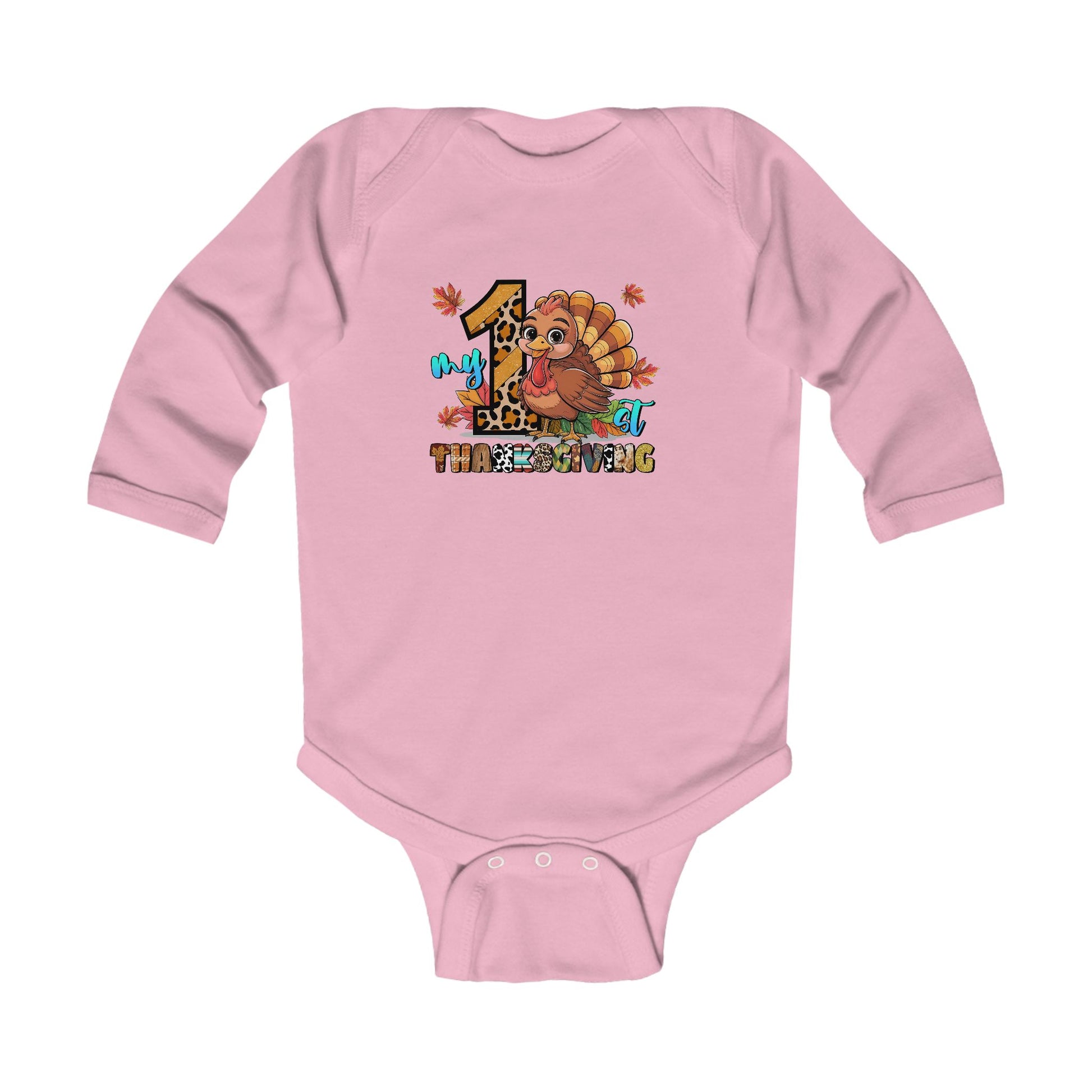 Celebrate your baby's first Thanksgiving with this adorable Infant Long Sleeve Bodysuit. Made from 100% combed, ring-spun cotton, this bodysuit is soft and lightweight, perfect for your little one's comfort. The ribbed knit binding and 3 snaps closure ensure ease of movement and quick changes. A must-have for the holiday season!