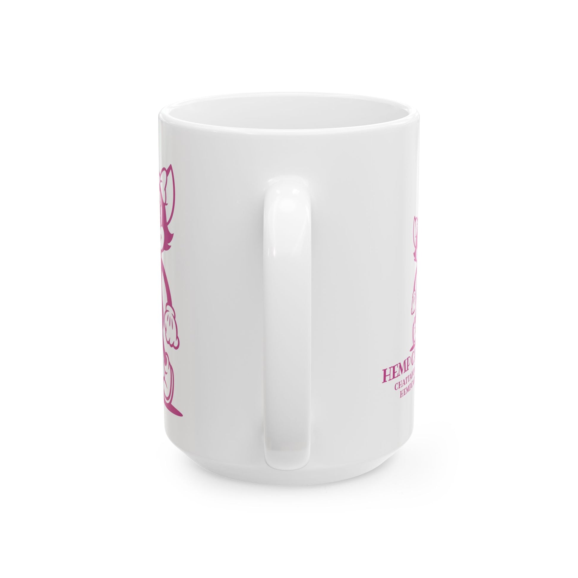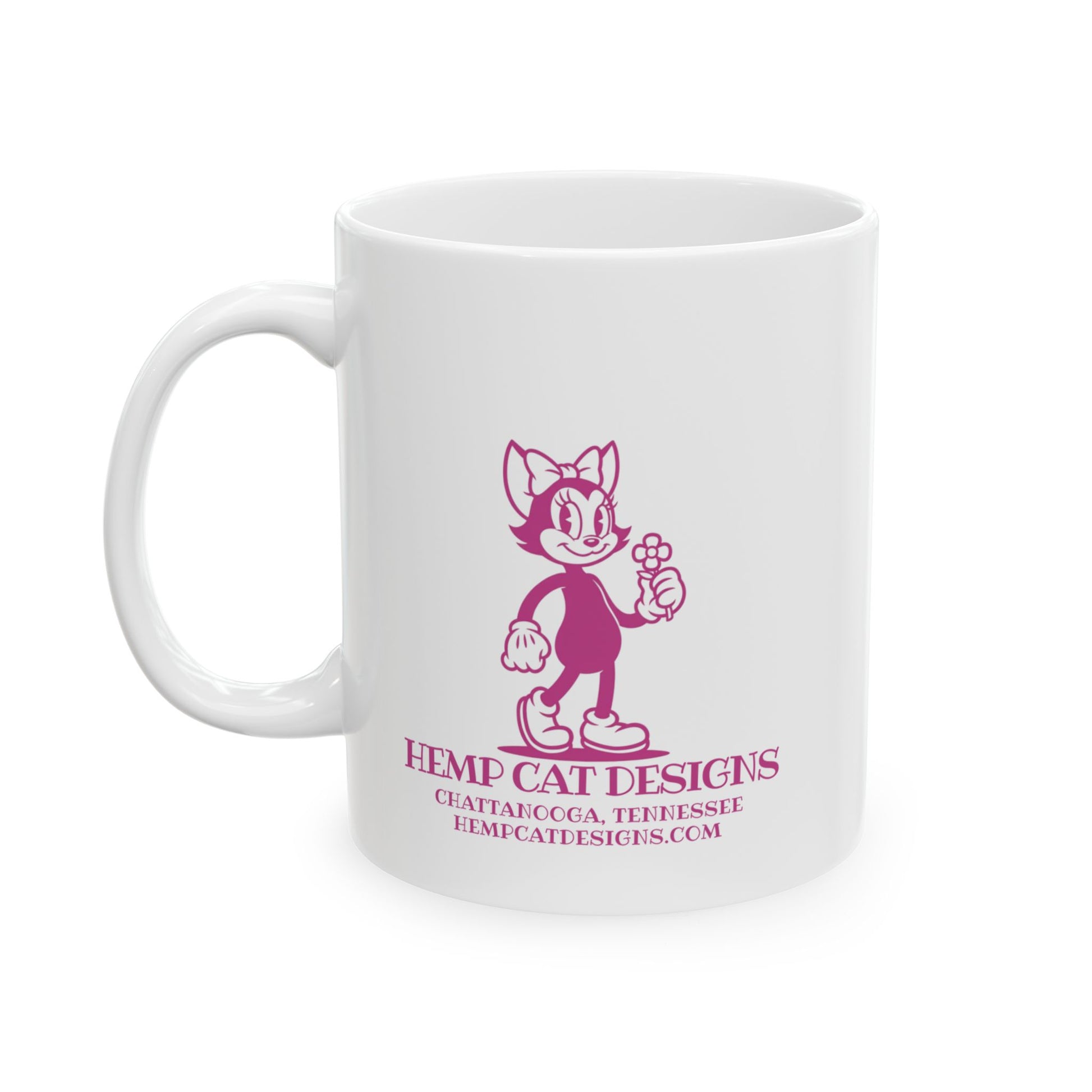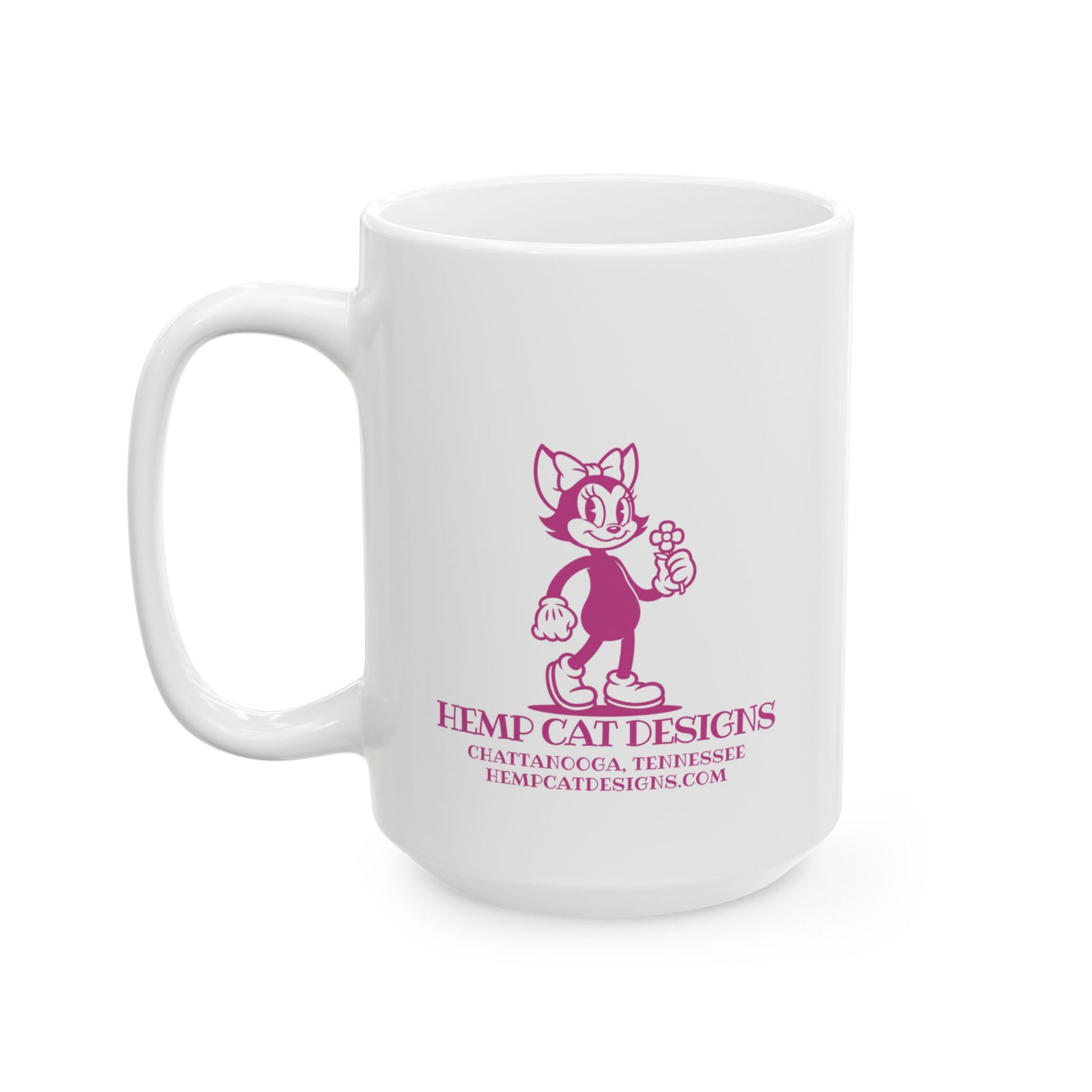 Mrs. Hemp Cat Holding A Flower Funny Ceramic Mug with Playful Design - 11oz & 15oz