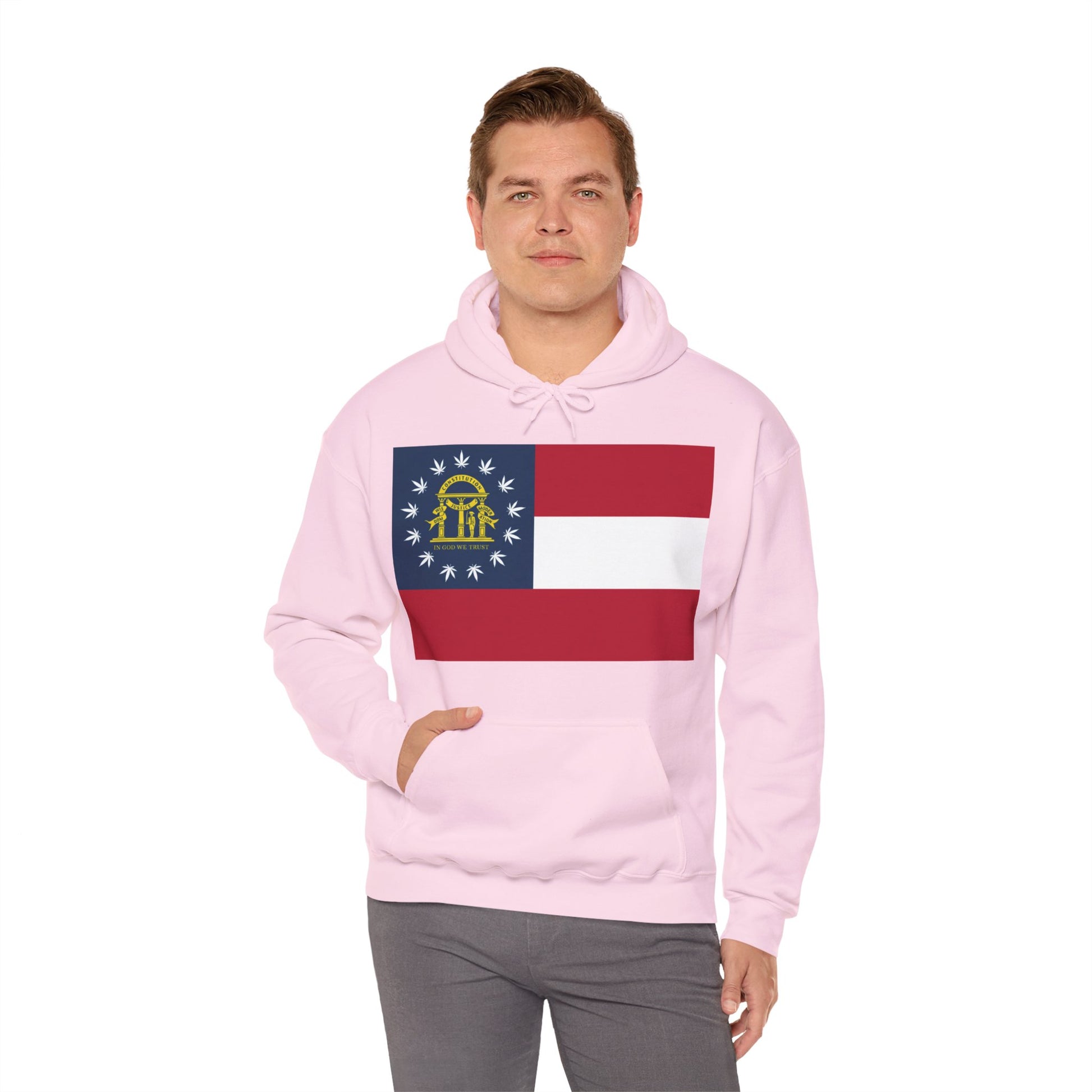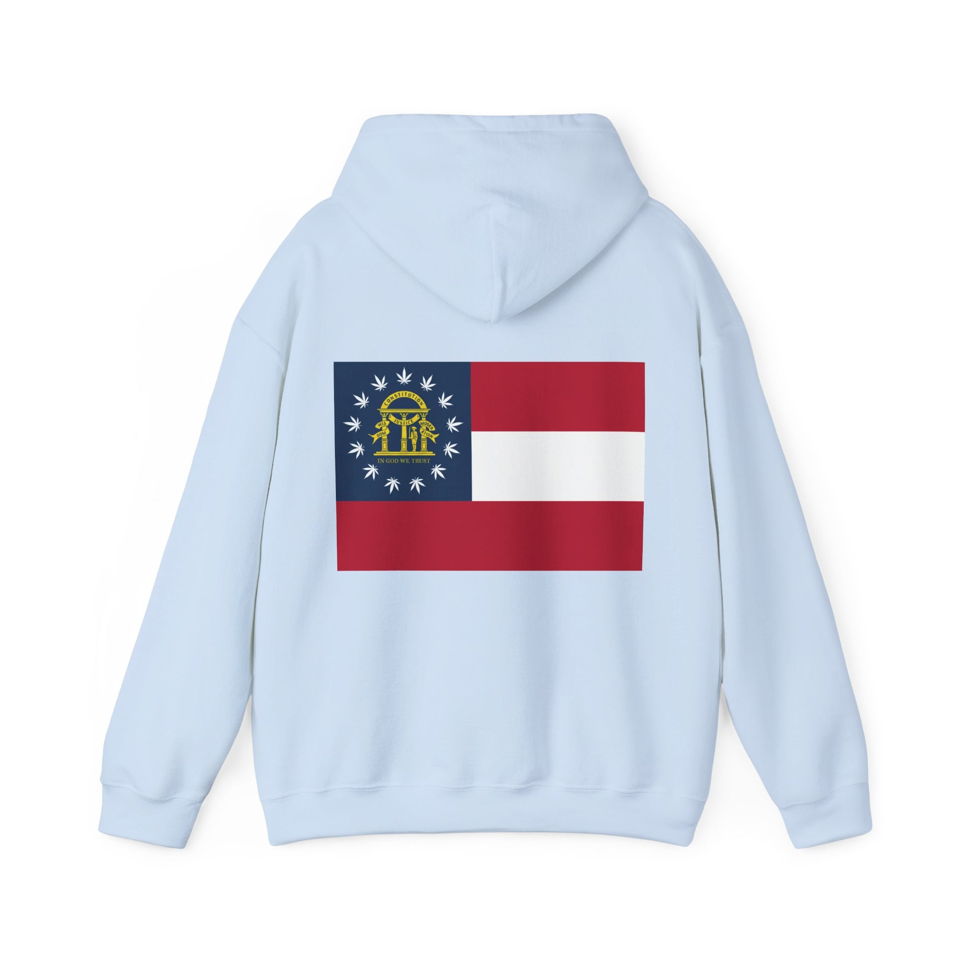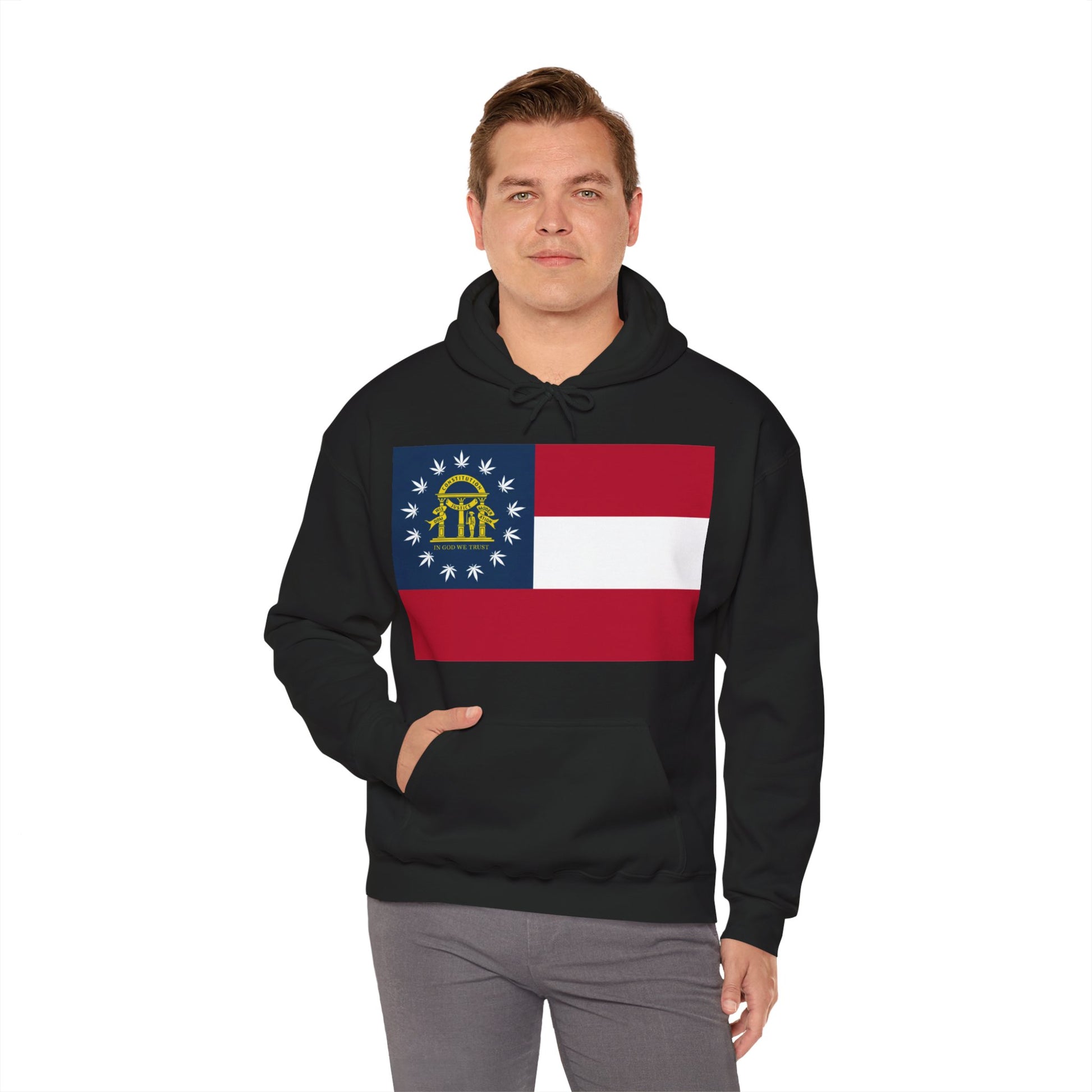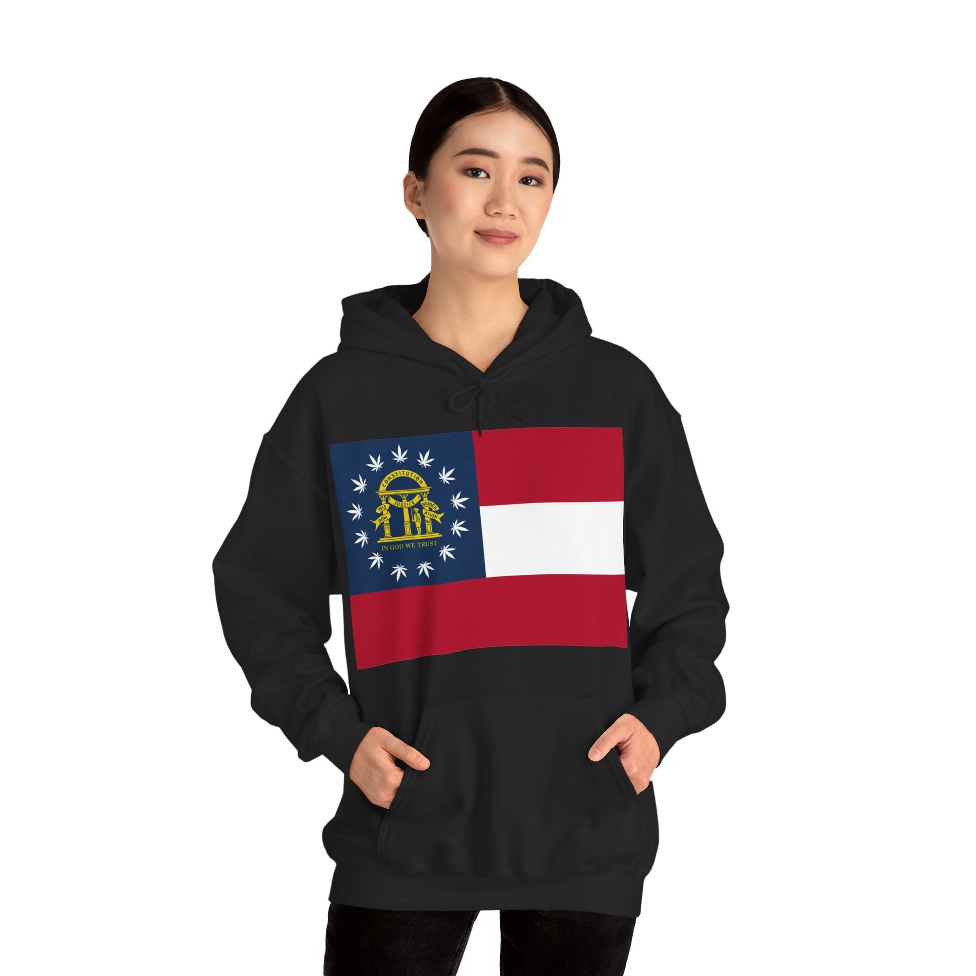 Stay warm and show off your Georgia pride with this cozy Georgia cannabis State Flag Hoodie. Perfect for festivals and makes a great gift for Georgians. Suitable for adults looking for stylish, comfortable outerwear for chilly days.