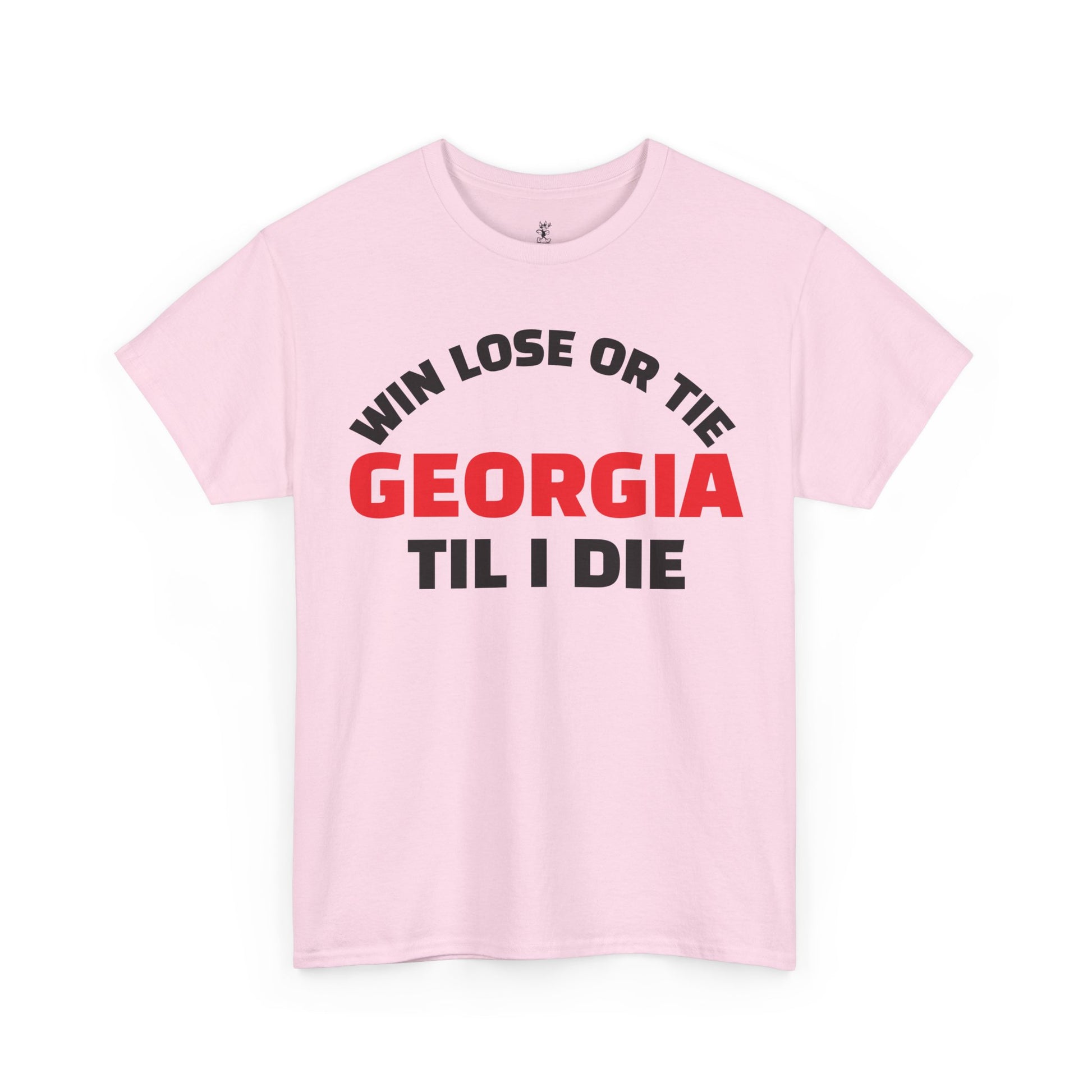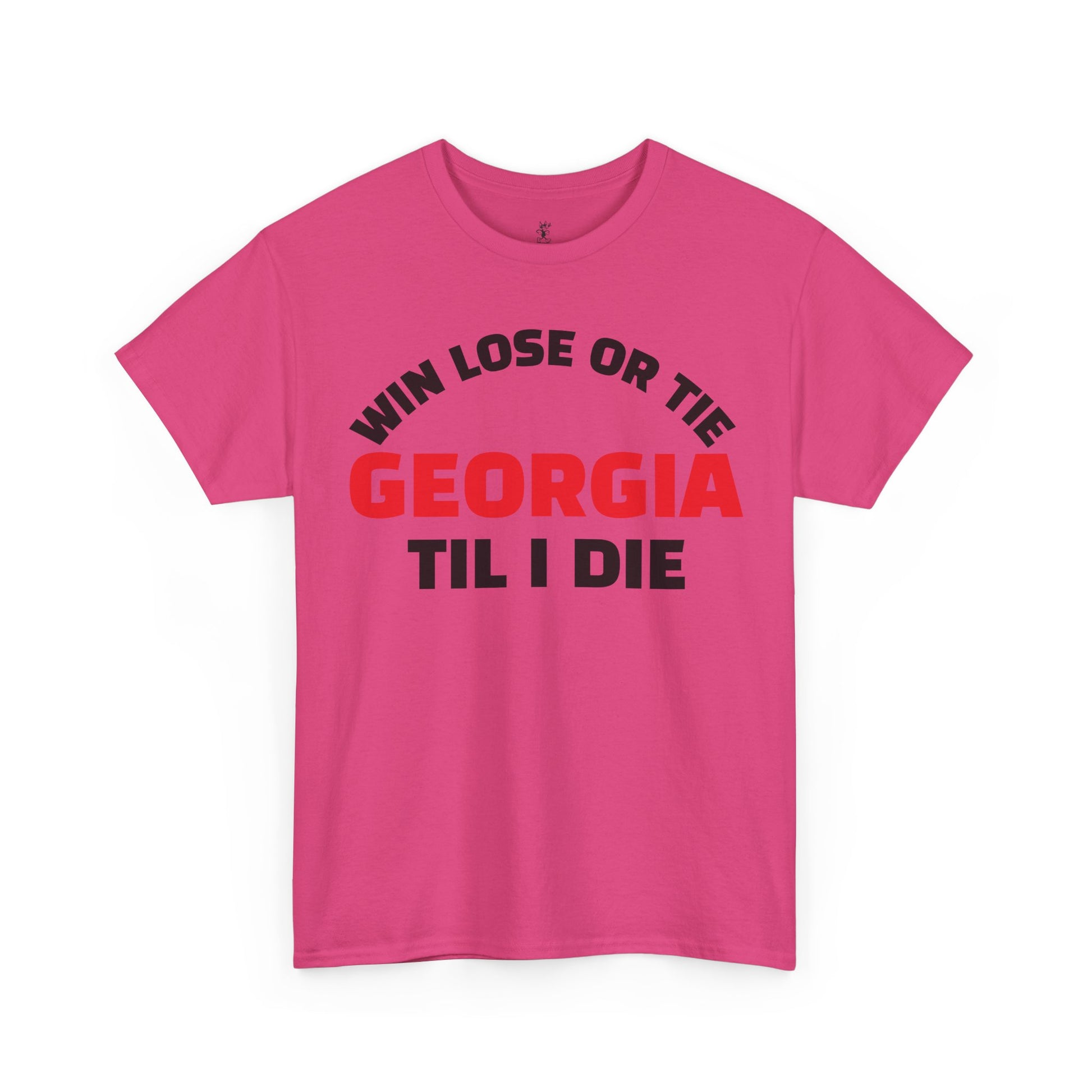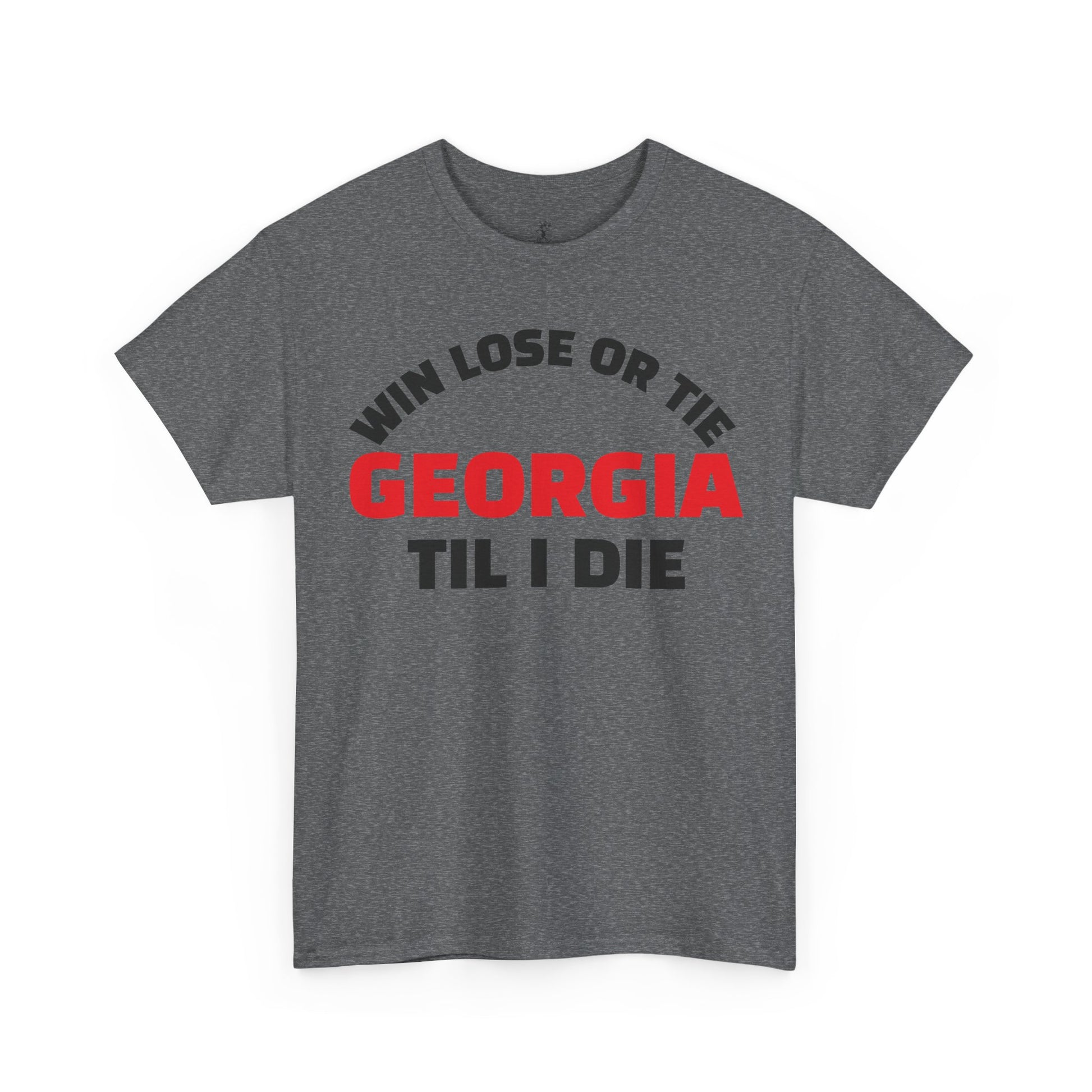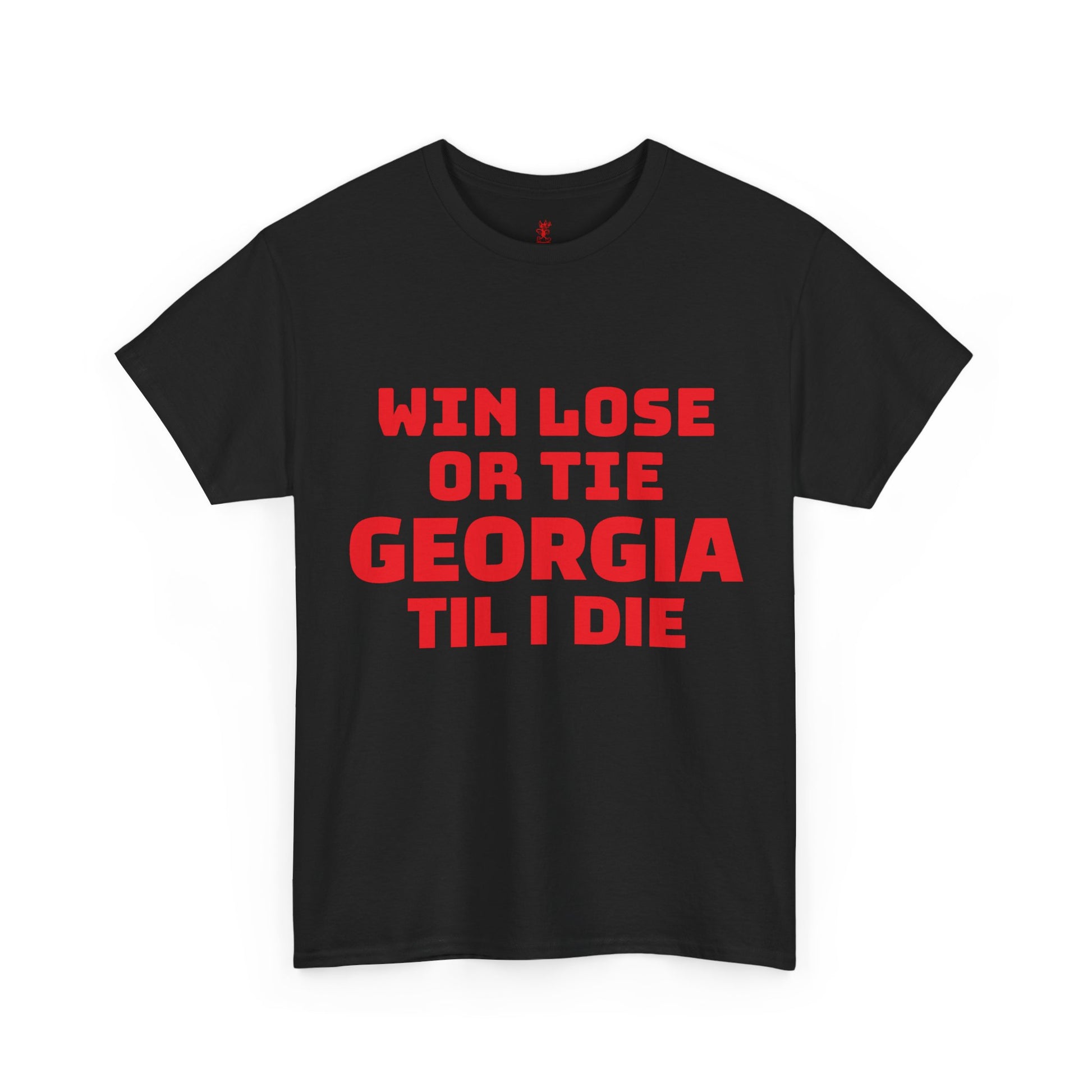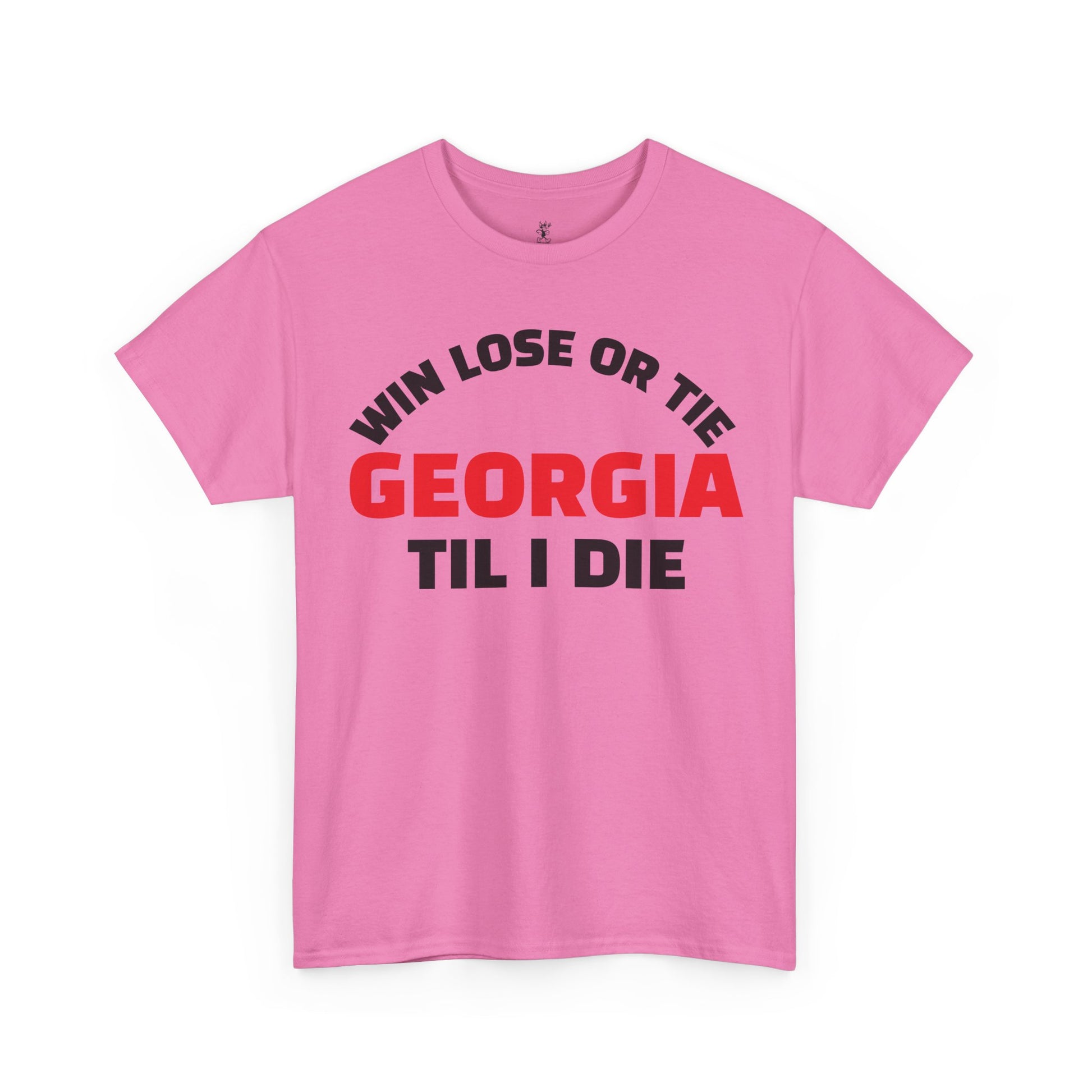 A classic heavy cotton Tee with a bold and loyal statement that reads 'WIN LOSE OR TIE GEORGIA TIL I DIE'. Perfect for die-hard Georgia fans who want to show their unwavering support. Suitable for adults and ideal for casual wear or game days. Relevant for Georgia Bulldogs fans, football enthusiasts, and supporters of Georgia sports teams. Great for tailgating, sports events, and as a gift for Georgia fans.