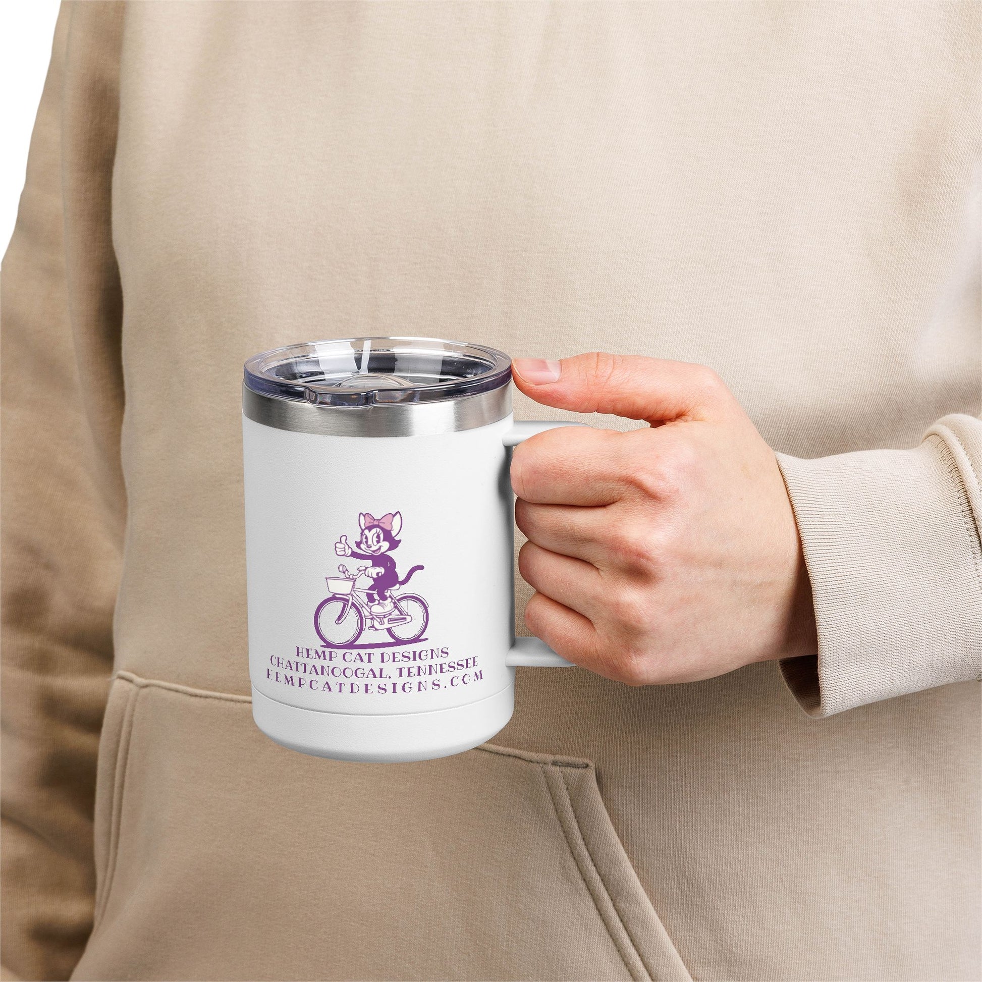 This 15oz stainless steel travel mug brings a playful, retro vibe to your daily coffee ritual. A cheeky “Mrs. Hemp Cat” pedals through a vintage-inspired scene, evoking slow morning rides, sunlit porches, and a wink of nostalgia. The ergonomic handle sits comfortably in your hand while the leak-proof lid locks in warmth or chill, letting you move through busy commutes or neighborhood errands without worrying about spills. The powder-coated finish and glossy print make the illustration pop, and the double-wall insulation keeps drinks at the right temperature for hours. It’s a tangible little moment of joy to carry with you — whether you’re headed to a market, tending a garden, or settling in for a relaxed afternoon at home.