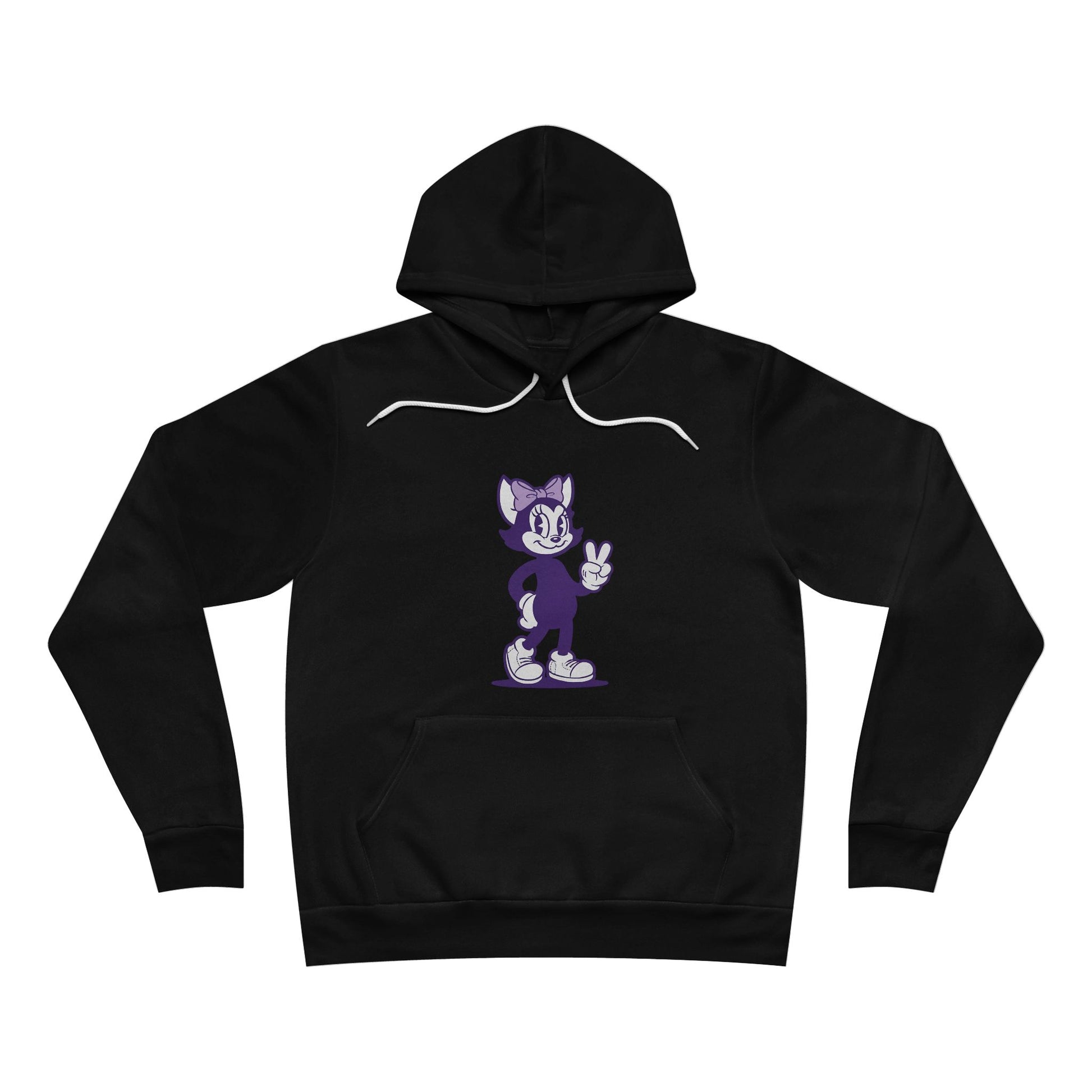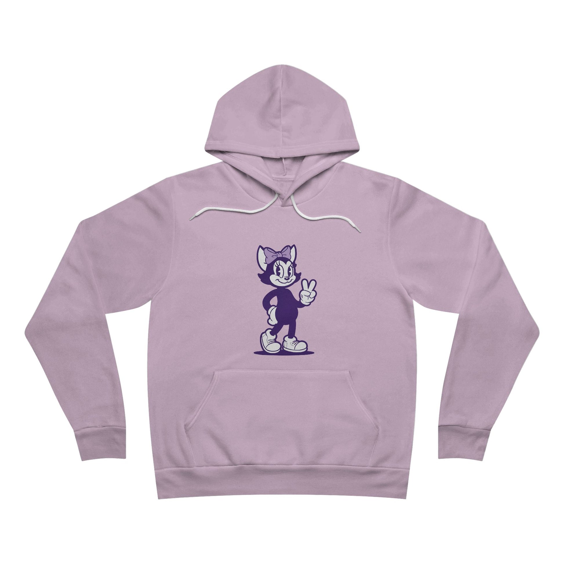 Playful cartoon cat pullover hoodie featuring Mrs Hemp Cat throwing a peace sign. This cozy and comfortable hoodie is perfect for cat lovers and those who enjoy quirky, fun designs. Ideal for casual wear or lounging at home, making it a great gift for birthdays, holidays, or cat-themed celebrations.