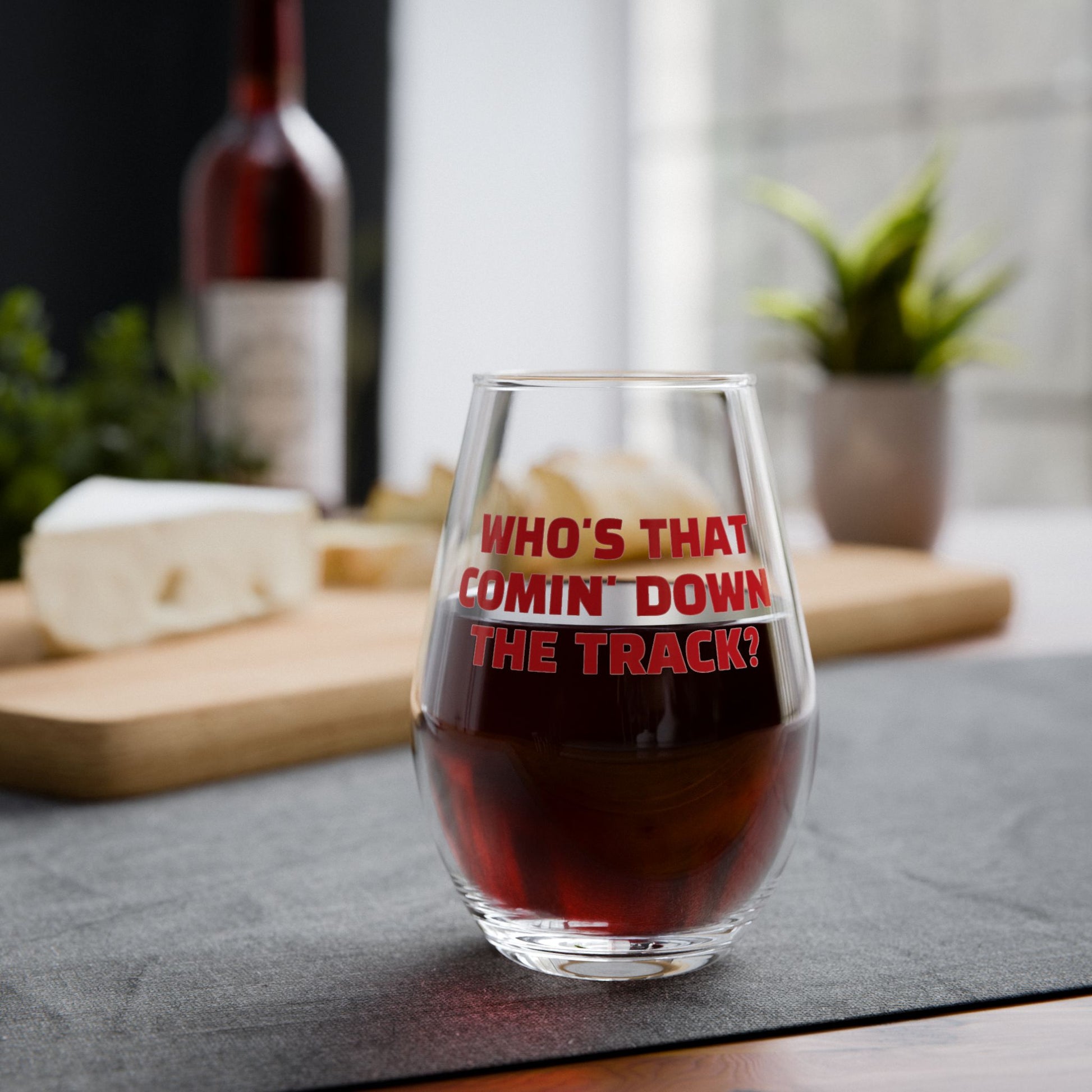 Elegant stemless wine glass featuring the quote 'WHO'S THAT COMIN' DOWN THE TRACK'. Perfect gift for DAWG lovers, adding a touch of charm and whimsy to any gathering. Ideal for those who enjoy unique and personalized drinkware. Relevant for birthdays, holidays, and special occasions.