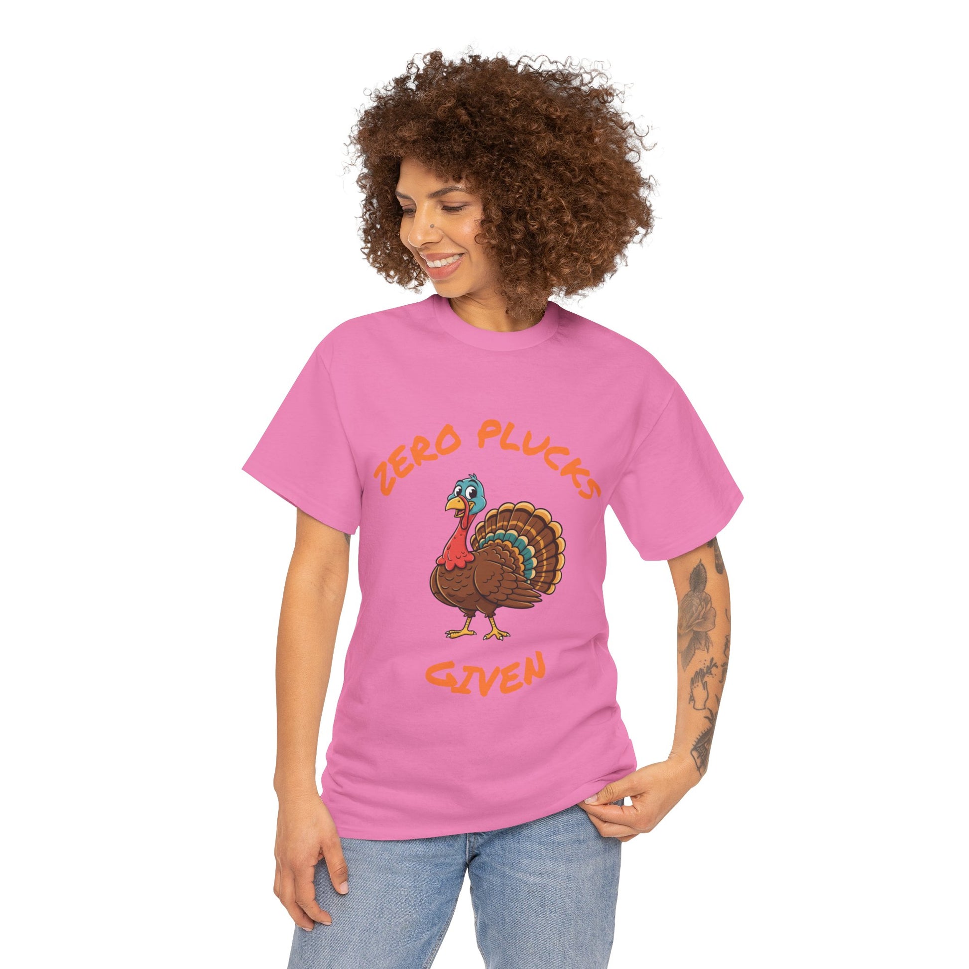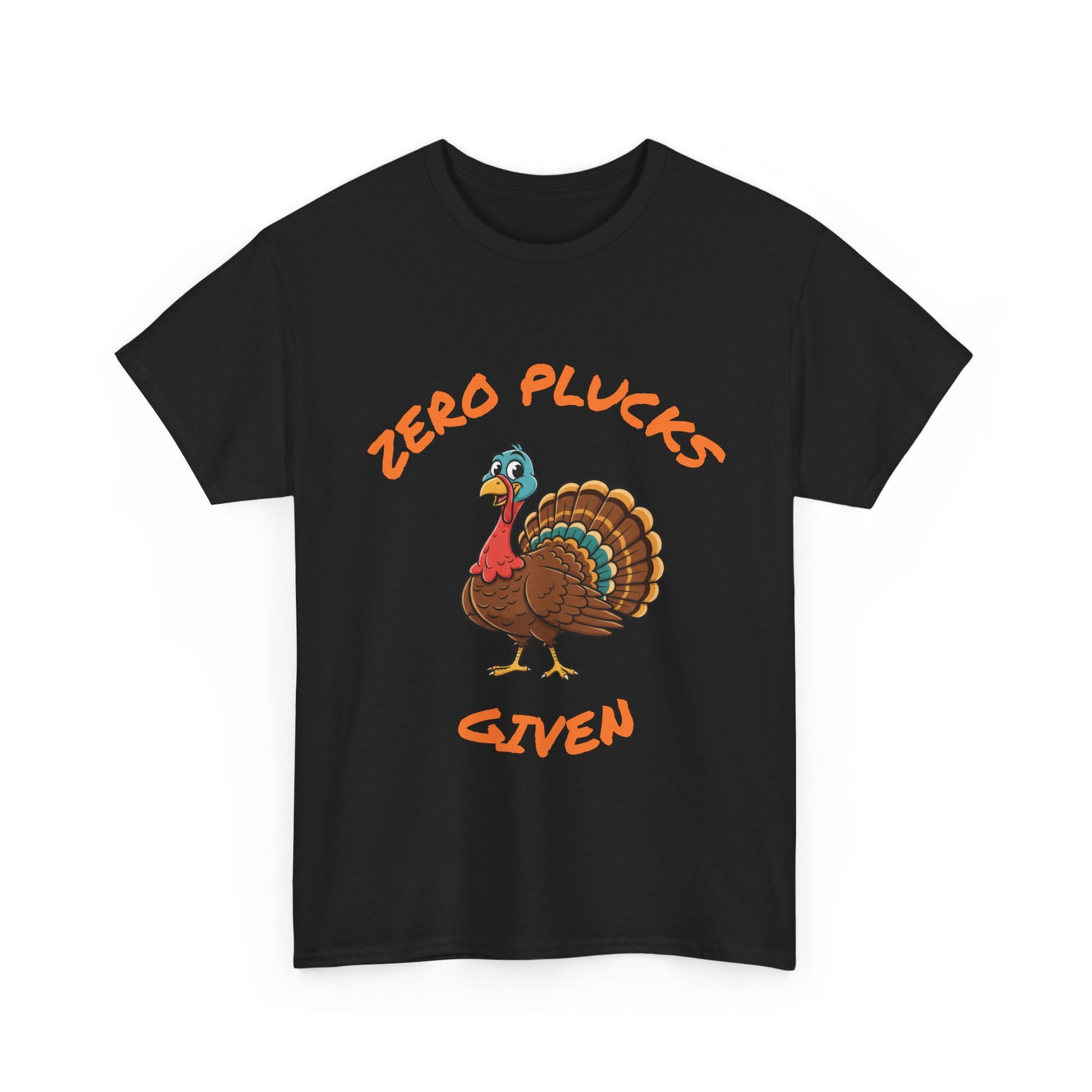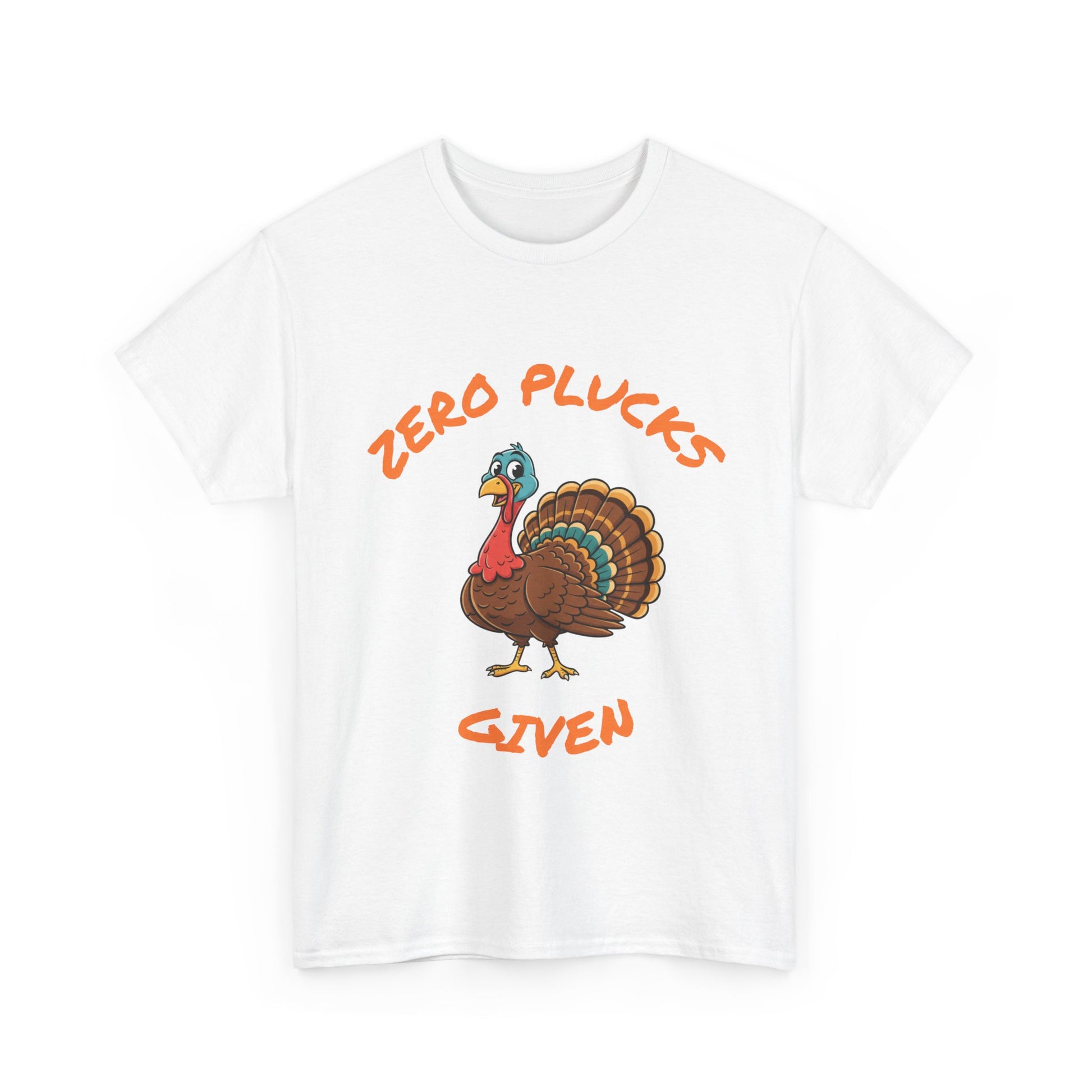 The Zero Plucks Given turkey T-Shirt is a fun and eye-catching garment perfect for Thanksgiving celebrations. It exudes a playful and festive vibe, making it a great addition to anyone's holiday wardrobe. This unisex tee is ideal for adults looking to add a touch of humor to their Thanksgiving outfit.