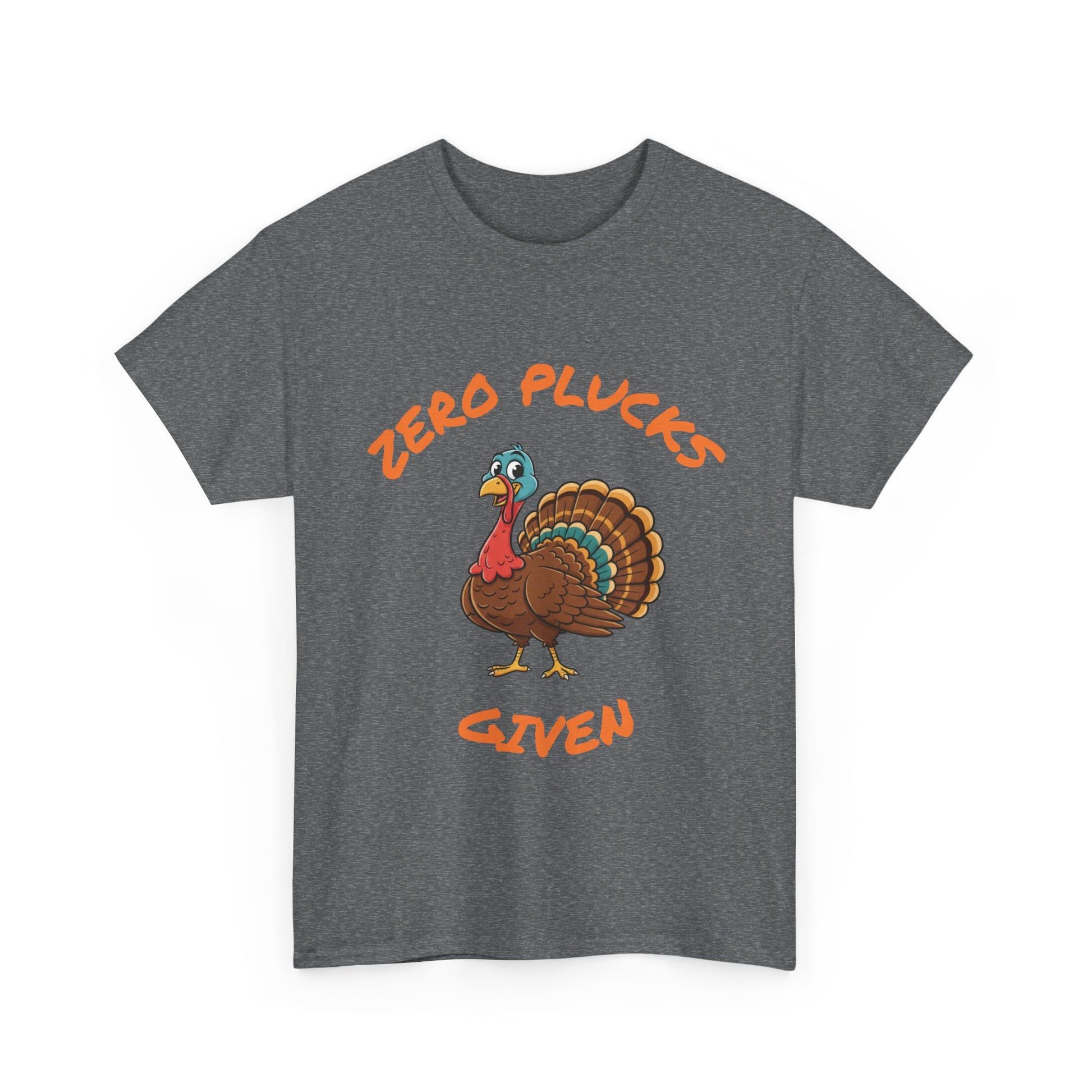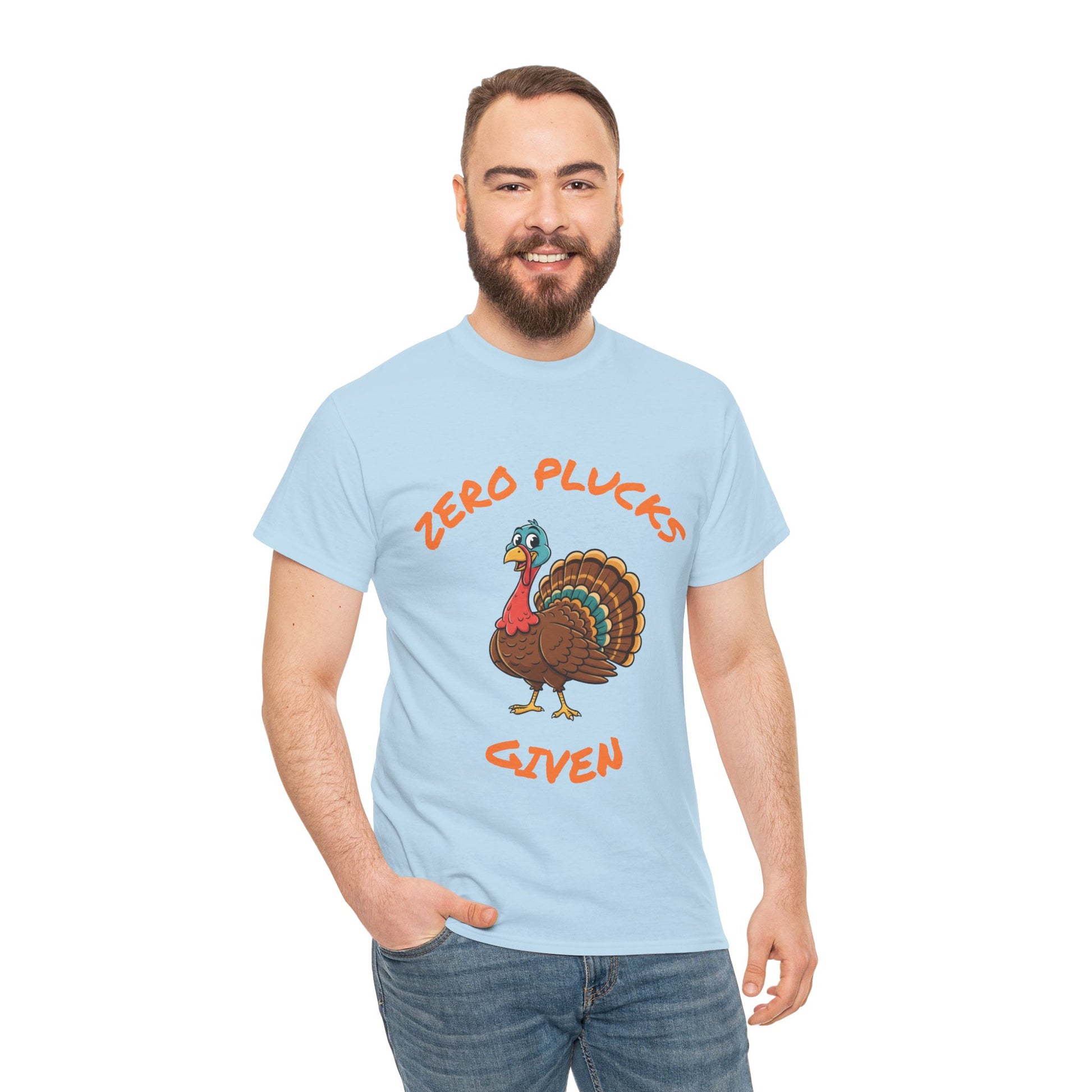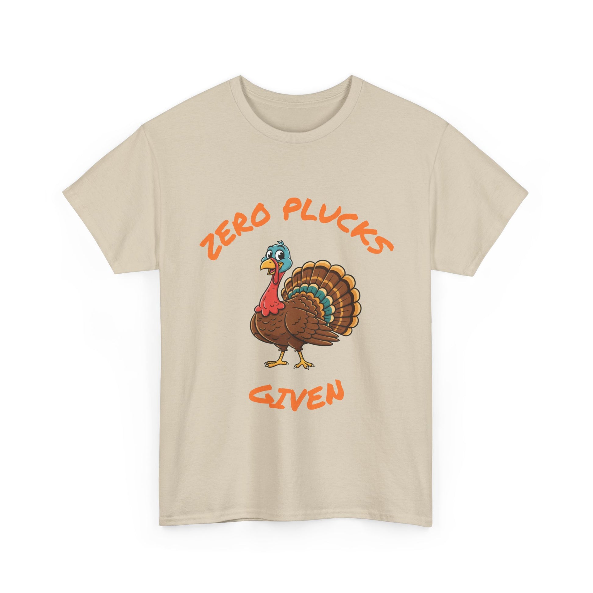 The Zero Plucks Given turkey T-Shirt is a fun and eye-catching garment perfect for Thanksgiving celebrations. It exudes a playful and festive vibe, making it a great addition to anyone's holiday wardrobe. This unisex tee is ideal for adults looking to add a touch of humor to their Thanksgiving outfit.
